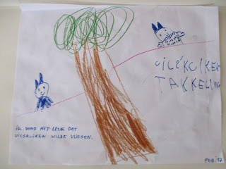 Feline tekende de twee uiltjes ‘Uilskuiken’ en ‘Takkeling’ bij hun boom ‘Appelaar’.