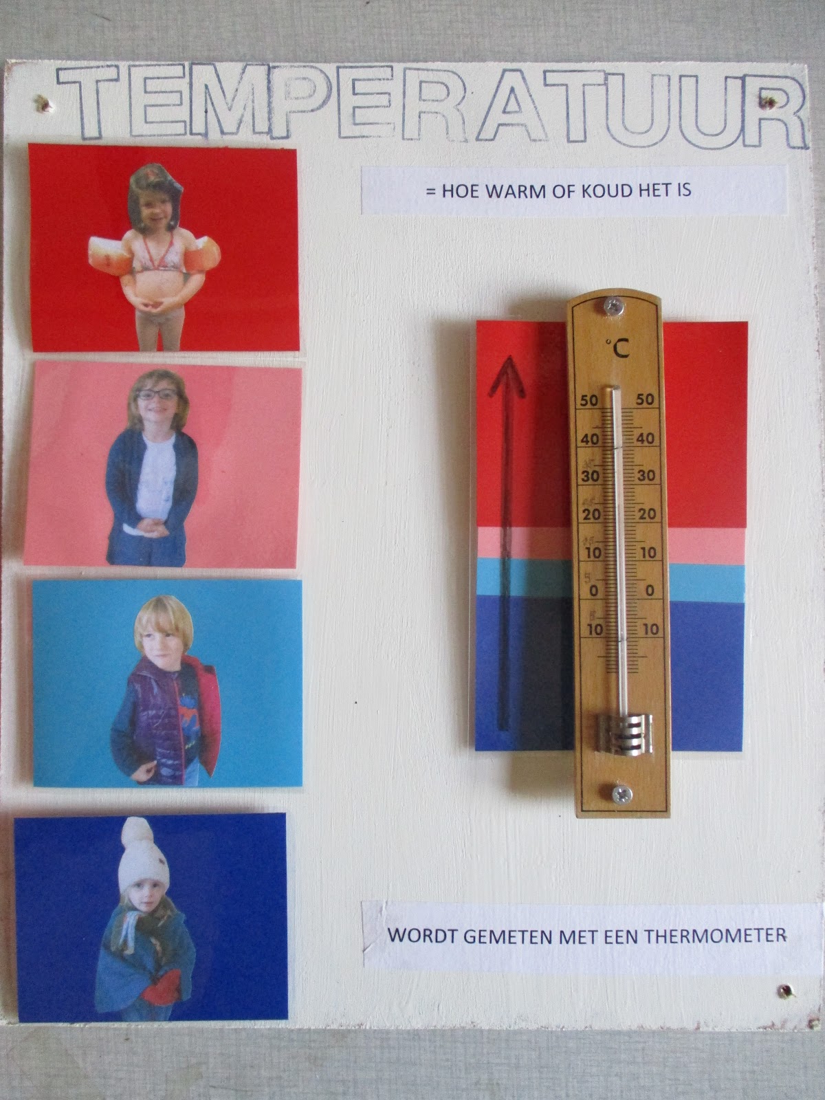 Nu kunnen we zelf de temperatuur aflezen in onze klas. Vrijdag namiddag was het ‘zwembroekenweer’.