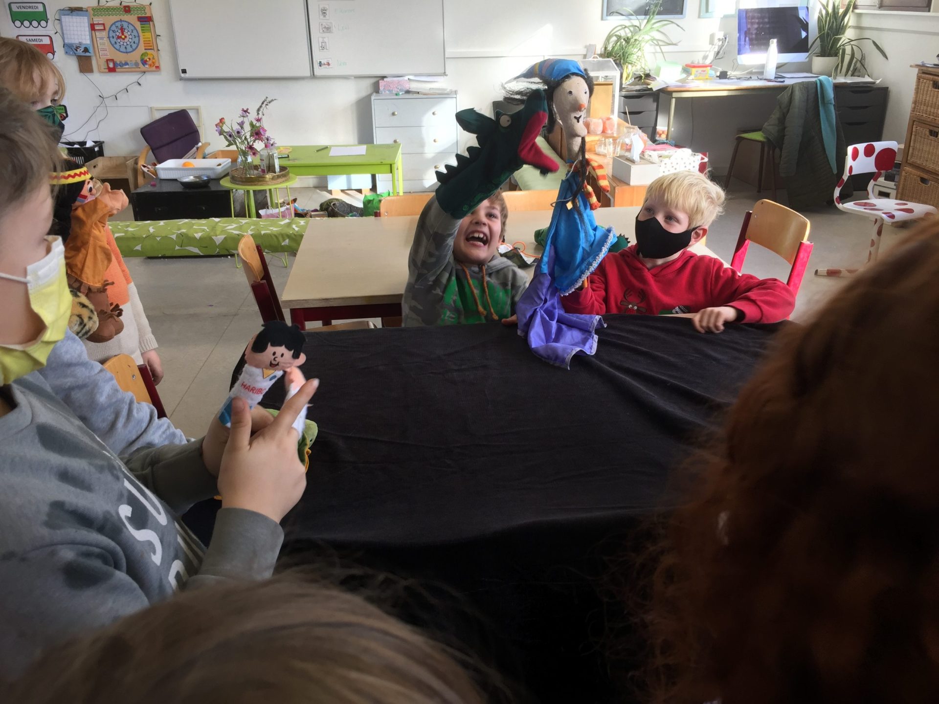 Gisteren ontdekte de kinderen de poppenkastpoppen. Verschillende groepjes wilden toneel spelen voor elkaar en gingen er verder mee vandaag. Daarom haalden we twee dozen vol poppen bij de kleuters. We werden hier heel blij van! Donderdag gaan we verder poppen maken, dus materiaal is welkom!